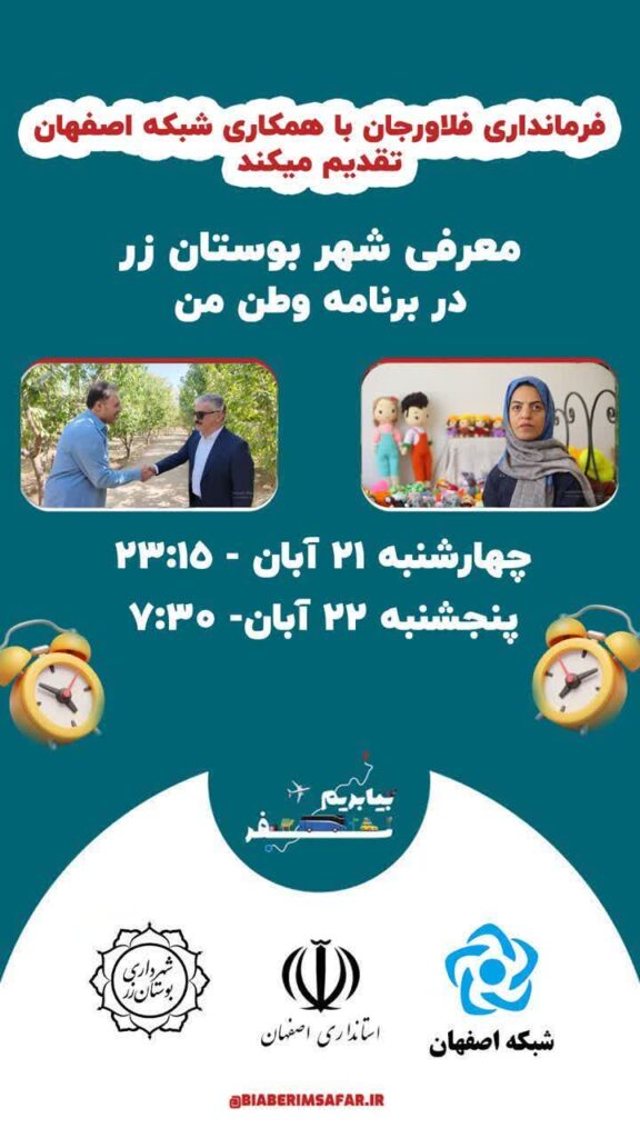 فرمانداری شهرستان فلاورجان و شهرداری بوستان زر با همکاری شبکه اصفهان با افتخار تقدیم میکنند : معرفی شهر زیبای « بوستان زر » در برنامه تلویزیونی وطن من از شبکه اصفهان 🗓 چهارشنبه ۲۱ آبان پس از خبر ساعت ۲۳:۱۵ و روز بعد پنجشنبه ۲۲ آبان ساعت ۷:۳۰ صبح @بیا بریم سفر ❇️ روابط عمومی […]