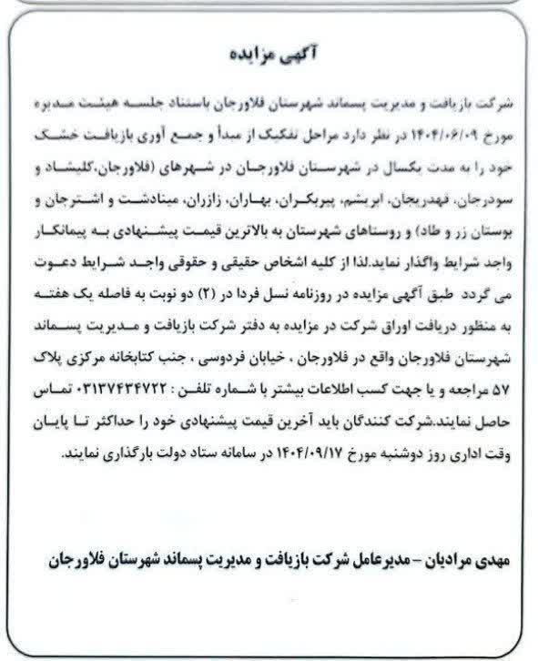 #آگهی_مزایده شرکت بازیافت و مدیریت پسماند شهرستان فلاورجان ┄┅══𑁍⟢꧁☫꧂⟣𑁍══┅┄ ✅ فرمانداری شهرستان فلاورجان 🆔https://eitaa.com/farmandari 🌐https://ostan-es.ir/falavarjan ❇️ روابط عمومی شهرداری و شورای اسلامی شهر بوستان زر
